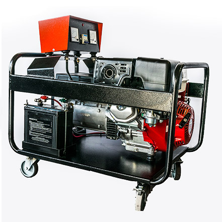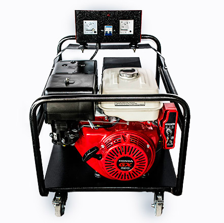 La parte motriz compuesta por un motor de 4 tiempos a combustión interna del tipo naftero de fabricación japonesa marca HONDA de 390 cm3 de 13 Hp con válvulas a la cabeza de bajo nivel de ruido de la línea OHV de reducido nivel de consumo de combustible y aceite, aumentando la potencia de salida e incrementando la durabilidad del motor , enfriado por aire forzado por medio de turbina eyectora comandada por el cigüeñal con una relación de compresión de 8:1 con sistema de encendido transistorizado sin platinos sistema de arranque manual por medio de cuerda retráctil y electrico de 12 Volt y bateria de puesta en marcha Con tanque de combustible de 8 Lts. Lo que nos brinda una autonomía de aproximadamente 4 Horas continuas, del tipo monocilindrico inclinado a 25 Gdos del tipo horizontal a 3000 r.p.m.( O especificamente acondicionado para funcionar con gas)